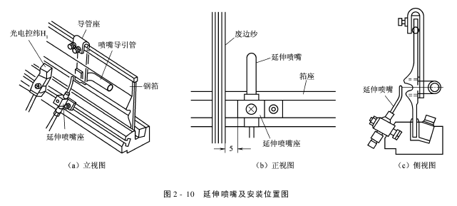 (4)延伸喷嘴:延伸喷嘴也喊牵伸喷嘴,安装在末一只辅助喷嘴之后,位于布幅之外。延伸喷嘴的结构和辅助喷嘴相似,供气时间长,可牵引纬纱伸直。当主、辅喷嘴先后关闭后,延伸喷嘴仍继续保证喷射,以免在综平前纬纱反弹。用于预防纬纱反弹产生纬缩等,多用于纬纱为强捻长丝或包芯纱等场合。采纳较高的气压会增添织机气耗量(图2-10)。