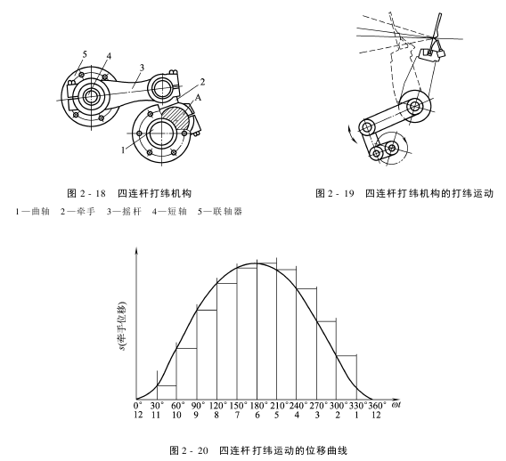 四连杆打纬机构的优点是结构容易,高速运转时休闲较平稳,振动相对较低。缺点是在后心时相对静止时间短,纬纱飞行时间要求严格,不利于宽幅织机高速运转。喷气织机上采纳的四连杆打纬机构多为短牵手形式,它比中、长牵手四连杆打纬机构在后心的相对静止时间稍长,更有利于引纬,而在前心时加速度相对稍高,有利于打纬。四连杆打纬机构以及其打纬休闲、打纬休闲的位移曲线分离见图2-18~图2-20。