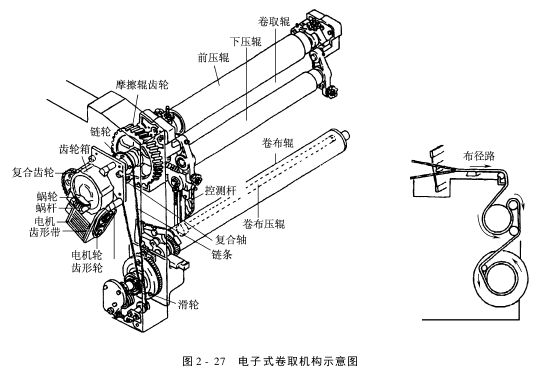 电子式卷取机构可以和赠经机构相结合,在微处理机操纵下调整织口位置,以提高面料质量。