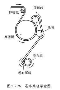 2.卷布路径(图2-26)面料先经伸幅辊,绕过摩擦辊(卷取辊),再经前压辊,下压辊,压布辊,卷到卷布辊上。布料在前压辊与下压辊的作用下紧贴摩擦辊,并有大的包角,使摩擦辊对布料有大的握持力,达到均匀精确地将面料引离织口的目的,并满足不停车落布的要求。