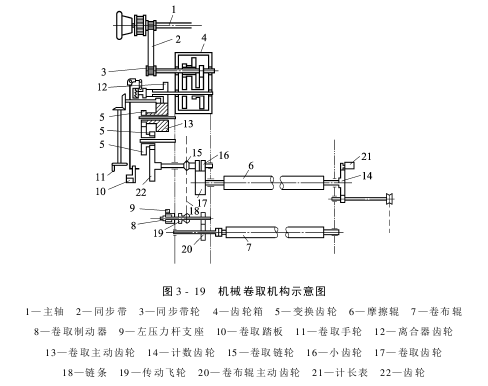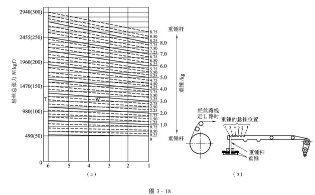 (1)上式计算,经纱总张力为130kg。 (2)在图3-20中130kg位置上画横线T。 (3)T和重锤重量线的交点,即为重锤重量3.25kg。 (4)T和斜线的交点向下引申至重锤的悬挂位置,如非整数,取接近的位置。 图3-18所示张力和重锤的关系,只是理论计算值,只能作为参考。实际应在织机上机运转后,视其运转情况而定。 对于电子送经,则通过操作盘预先设定上机张力。还可以通过相关参数的设定,使开车时经纱张力和停车时的张力完可能一致,以及对织口位置的操纵,很好地预防停车档的发生.
