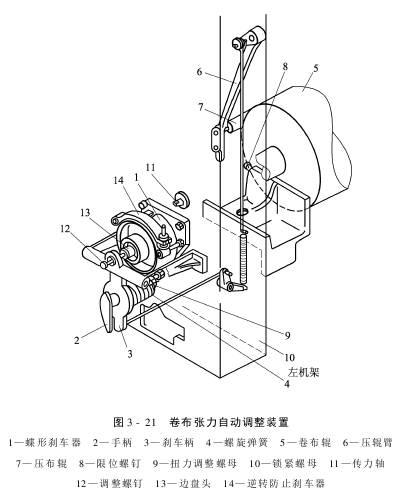 (2)若要变的纬密超出织机的送经变换齿轮所能覆盖的密度范围时,则需将送经变换齿轮和卷取变换齿轮重新组合。 (3)不同规格的A齿轮在卷取手柄轴2上有不同的安装位置,安装时要注意。 3.卷布张力自动调整装置 织机运转过程中,随着卷布辊外径逐渐增大,依靠卷取制动器的打滑作用,使卷布辊转速变慢,从而使织物保持肯定的张力,如图3-21所示。其中,14为防倒转装置,用来预防织机在运转过程中因织物张力过大而引起的卷布辊倒转。通过调整手柄轴2和刹车柄3、扭力调整螺母9及锁紧螺母10可实现卷布张力的自动调整。