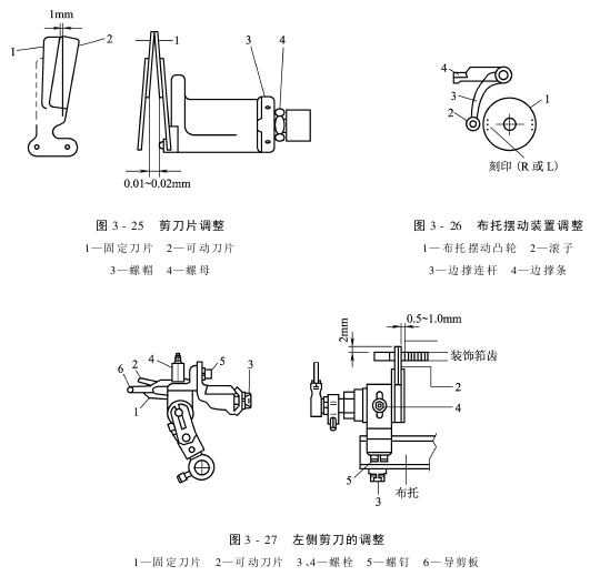 剪刀的调整 1.剪刀片的调整(图3-25) 当剪刀片换用新片或经研磨过刀片要装配时,肯定要调整好刀片间的位置。 (1)固定刀片1和可动刀片2的刀尖要有1mm的重叠。 (2)固定刀片和可动刀片的后端,相互之间要有空隙,其程度以螺帽3旋转松紧适度后用螺母4锁定,经锁定后的空隙要有0.01~0102mm为佳。 2.布托摆动装置的调整(图3-26) 旋转卷取手柄使布托摆动凸轮1的低顶点(R或L的刻印部)和凸滚子2对上,此时将边撑条调整到水平的位置 3.左侧剪刀的调整(图3-27) (1)左右的位置(图3-27):剪刀的刀片位置在钢筘的窗口内侧,钢筘的筘齿和剪刀的可动刀片2间的空隙调整在0.5~1.0mm范围,并用螺栓3固定。