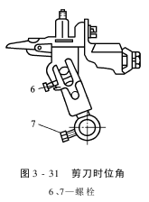 (1)左右的位置: ①以螺钉3使可动刀片和布撑的间隙定为1mm。 ②以螺钉7使固定刀片1和CC导板的距离定为25~30mm。 (2)前后以及上下位置: ①将时位轮转至0°。 ②以螺钉4调整钢筘和剪刀位置,使钢筘和剪刀尖端之间的间隙为2mm,若间隙过小,刀片可能会碰伤向前摆动的钢筘。 ③固定刀片1的尖端比经丝面低0.5~1.0mm螺钉4来进行调整。 (3)剪刀片的重叠量: ①以手动转动织机使可动刀片和固定刀片相咬深。 ②松开螺栓6,使可动刀片和固定刀片的刀尖重叠1~1.5mm,而后旋紧螺栓6。 (4)剪切后的残丝根数:启动织机引进纬丝,经剪刀剪切后,若残留纬丝根数过多时,宜将刃尖处的重叠量略为增多。相反过少时,需将重叠量减少。残留丝条数以4~5条为标准。 5.剪切时位角(图3-31) 左侧剪刀剪切时位角调整: (1)将1根纬丝引入梭口。 (2)将剪刀连结杆的螺栓6松开,用手回转时位轮,转至欲剪丝的角度。 剪丝时位角通常为: 涤纶丝(Polyester)为15°±5°,尼龙丝(Nylo)为10°±5° 注意:调整时不要松开剪刀连结杆的螺栓7(螺栓7顶紧在摇动轴的整理平面上)。 (3)在剪刀断丝时,将螺栓6旋紧,固定住可动刀片。 (4)再度将纬丝引入1根,手动回转时位轮,试行剪丝,能依照设定角度完成剪丝即可。