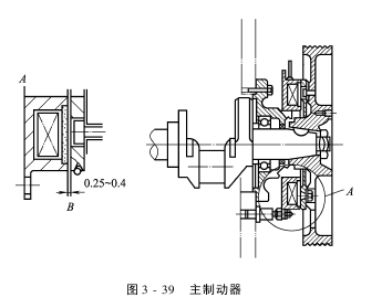 喷水织机普遍采纳单片式电磁制动器(3-39)。由动片(金属摩擦材料)和静片(表面为非金属摩擦材料,内部并埋有线圈)组成。其结构简单、使用方便。电磁制动器按线圈种类分为单线圈和双线圈两种形式。沈阳宏大纺机公司(沈阳纺机厂)及丰田公司(即原尼桑公司)生产的喷水织机使用单线圈式电磁制动器;津田驹及引春公司生产的喷水织机使用双线圈式电磁制动器,即高压线圈和低压线圈。