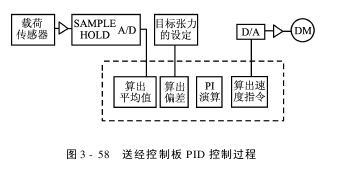 送经操纵板的PID操纵过程见图3-58。它是由单片机系统通过A/D电路检测过程y,并计算误差e=u-y和操纵变量u,通过D/A变换后输出到执行机构(伺服电动机),使过程变量y稳定在设定值上。这种操纵是根据采样时刻的误差值计算操纵变量u的,是一种采样操纵。