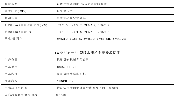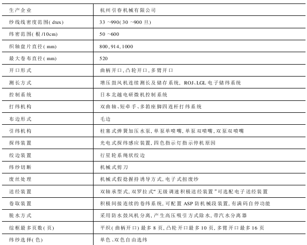 JW800型系列喷水织机是引春机械股份有限公司(中国台湾省)于1997年在浙江省萧山市国家经济技术开发区独资建设的杭州引春机械有限公司生产的系列型喷水织机。 适织品种 适用于织造各种人造纤维,合成纤维为原材料的疏水性织物。合成纤维织物中包含复丝,加捻丝和免浆用丝,织物重量范围为40~500g/m 。纬丝范围33~990dtex(30~900旦)。双泵双喷机可适合两根纤度差异较大的织造。 结构型式 箱型墙板,异型钢管加强型横梁,构架稳固,振动小。 开口装置 曲柄四连杆开口装置可织造平纹织物(多8页综框)。可配备积极式凸轮开口装置(多10页综框),可配备多臂开口(多16页综框)。 引纬装置 采纳高压 水泵或双水泵,新型环状喷嘴,射流的集中性强。 打纬装置 采纳短牵手双侧驱动多筘座脚四连杆打纬系统,轻量化打纬轴,减小机械振动。 送经装置 采纳重锤调节张力变化,无级调速的送经机构,经纱张力变化平稳,上机张力调节范围广,调整方便,不需其他装置进行补偿。 卷取装置 机械式连续间接卷取,张力自动调节机构,采纳杆式防卷皱装置,卷取张力适当,可加装ASP预防停车档装置。 测长装置 机械式采纳鼓式测长方式,电子测长装置采纳ROJ、LGL电子测长。 操纵系统 全套采纳日本北越电研的微机操纵系统,动作精确,故障少,可靠性强。 润滑系统 主传动为箱式油浴润滑,其它为润滑脂润滑。 型号示意:
