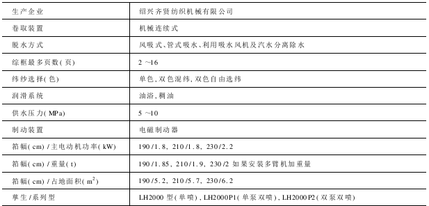 LH2000型系列喷水织机是绍兴齐贤面料机械有限公司自主开发的新机型。 适织品种 可织造疏水性化学纤维织物,如塔夫绸、雪纺、雨伞布、拉杆包布和精梳棉等。织物重量范围为50~500g/m 。织物纤维线密度范围为33~990dtex(30旦~900旦)。 开口装置 平织物可采纳曲柄连杆开口,可配备积极凸轮开口,综框多10页,多臂开口配16页综框。 打纬机构 采纳短牵手双侧驱动四连杆打纬,轻量化的打纬轴,减小机械振动。 引纬装置 采纳高压水泵和新型整流环喷嘴,提高射流的集束性和投纬能力。 送经装置 采纳了重锤调节张力变化的送经机构,使经纱张力变化更加平稳。从大经轴到小经轴过程中张力变化平稳,张力调节范围广,不需其他补偿装置。 测长装置 单喷机型采纳RS测长式电子测长,保证织机高速运转;双喷采纳储纬器(ROJ)自由测长方式。 卷取装置 采纳了张力自动调节机构,保证织物以佳张力进行卷取,同时采纳压杆形式防皱。 操纵系统 电气操纵采纳单片机操纵系统,具有动作精确、故障低、可靠性好显著特点。强电驱动大部分采纳无触点元件,提高电气寿命。同时采纳完电探纬,提高了探纬灵敏度。 润滑系统 采纳集中加油装置,适应高速,操作方便。 型号示意: