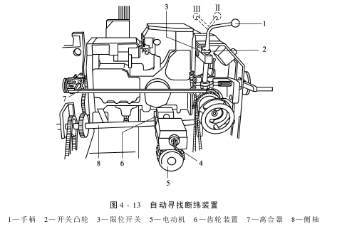 在织机正常运转时,定位开关9的触头位于连接圆盘7的缺口8中,定位开关12的触头12a位于连接圆盘10的缺口11中。这时电动机6没有供电,自动平综装置不起作用。 在织机停止时,按下按钮5,电动机6启动,回转180°,此时定位开关9的触头位于连接圆盘7的缺口8a中,而定位开关12的触头12a位于连接圆盘10的表面,由于定位开关12的作用,织机不能启动。这时综框处于平综位置。再按下按钮5,电动机6启动,又回转180°,这时两个定位开关9和定位开关12回复到原来的位置。 P7300型片梭织机自动平综装置具有两种平综位置: (1)把全部综框平齐在同一位置,以调节综框高度或更换开口凸轮。 (2)为自动寻纬把综杆平齐,但综框仅仅放平而未被举起,这样,使用自动寻纬装置,可以不移动综框,被织入的后一根纬纱张力保持不变。 三、自动寻觅断纬装置 片梭织机自动寻觅断纬装置如图4-13所示。为了寻觅断纬可使手柄1从位置Ⅰ转到位置Ⅲ,然后再转回到位置Ⅱ,此时自动寻觅断纬装置发生以下动作: