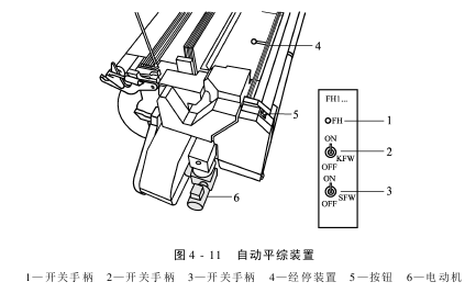 插件上的开关手柄2(KFW)及开关手柄3(SFW)不同的位置可以取得不同的操作状态:开关手柄2(KFW)及开关手柄3(SFW)都在“OFF”位置,则自动平综装置不起作用。开关手柄2(SFW)在“ON”位置,则经纱断头后,自动平综装置使梭口自动提升。开关手柄3(KFW)在“ON”位置,则纬纱断头后,自动平综装置使梭口自动提升。自动平综装置的工作和复位过程,如图4-12所示。