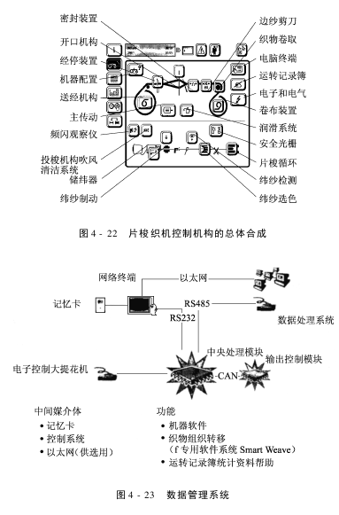 片梭织机的电子电气操纵系统的终端为触摸屏,触摸屏上设有操纵机构的总体合成、织物组织操纵系统、数据治理系统、运转记录簿、统计资料、诊断指示和援助系统。其操纵机构的总体合成如图4-22所示。数据治理系统如图4-23所示。