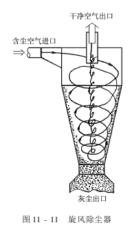 旋风除尘器(图11-11),又称沙克龙,材料由白铁皮加工而成,结构由圆筒体、圆锥体、排风管、进风口及盛灰斗组成。筒体、锥体、排出管与排灰口位于同一条轴线上。其利用含尘气流作旋转休闲时,作用于尘粒上的惯性离心力将粉尘从气体中分别出来,当含尘空气以较高的速度沿下旋形进口切向进入后,在内外圆筒之间做自上而下的螺旋形旋转休闲,较大的尘粒在离心力的作用下,被甩到筒体内壁,和壁面摩擦、碰撞而失去速度,在重力与自上而下气流的作用下,落究竟部盛灰斗处排出。而净化后的空气,随锥体部分的收缩而逐渐向锥体中央靠拢,在快接近底部时,又受究竟部所阻,旋转向上而形成返卷气流,后由排风管排出。 这种除尘器的优点是结构容易、制作方便、造价低、占地面积小、维修治理方便,如建造面积有限,也可安装在室外,特别是当有火种进入除尘器内时,有利于预防火种的蔓延,安全作用较为明显。对20~30μm的粉尘净化效率可达95%以上,是不少厂家乐于采纳的一种高效除尘器。但该除尘器的阻力比较大,即耗电量比较高,运行花费高,虽除尘效率比重力沉降室高,但对纤维性的细小粉尘很难所有净化,因此,旋风除尘器多用作多级除尘中的初级除尘器。由于旋风除尘器是一种高压除尘设备,所以它不适合于集棉、集绒等低压网路中。当处理风量较大时,可采纳几个沙克龙并联使用,且直径不要过大。 使用旋风除尘器时应小心: (1)沙克龙的进口风速不能过大,以免增添阻力,也不能过小,以免影响除尘效率。普通操纵在10~16m/s为宜。 (2)制作时应使排风管中央、筒体中央、锥体中央在一条垂直线上,以免影响排风效果。 (3)应小心底部的密封性。当延续清灰时,应使用阻气阀并小心检查胶皮是否脱落。阻气阀的转速不能过高。定期清灰时,应小心底部的密封性,以防漏风。 (4)几个沙克龙并联使用时,应采纳偶数,各分支管的截面积之与应等于总管的截面积。 (5)各分支管道之间的夹角不宜过大,普通不超过30°。 2.预分别器