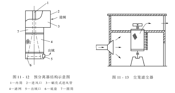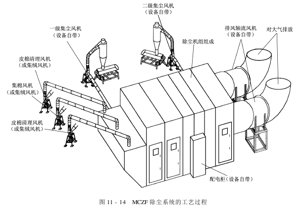 预分别器(图11-12)是集沙克龙和布袋除尘原理于一身的一种设备。预分别器的优点是细小粉尘和绝大部分空气透过筛网排出,中粗颗粒的纤维性尘杂,被阻留在筛网的内表面,随少部分空气继续向下旋转,由尘绒排杂口排出,实用纤维便于清理归收,改变滤网目数可有效地归收棉花加工厂各环节的尘绒,且阻力较小;缺点是除尘效率低,所以普通都作为二级除尘的预处理。 3.尘笼滤尘器 尘笼滤尘器有站式与卧式两种形式,棉花加工厂通常使用站式尘笼滤尘器,如图11-13所示。尘笼滤尘器结构容易,不易燃烧,使用方便,处理风量大,阻力较小,普通为150~200Pa,占地面积省;其缺点是由于尘笼普通都采纳金属丝网作为过滤材料,因孔眼较大,短纤维和细小粉尘较易通过,不仅损失纤维,而且增添清理归收负担,影响除尘效率。因此,它只适用处理绒毛稍长与大颗的粉尘,作为初级除尘设备,较为适宜。 尘笼滤尘器除尘效率的高低取决于网孔的规格。网孔大,阻力小,但除尘效率低。网孔小,除尘效率高,但阻力大。此外,排风阻力还随尘笼面过滤风速的增添而增大。尘笼滤尘器的规格可参考以下数值: 当轧花机刷绒排风时,过滤风速可取1100~1400m3 /hm2 ,可采纳24孔/25.4mm镀锌低碳钢丝布。当剥绒机侧绒排风时,过滤风速可取900~1200m3 /hm2 ,可采纳(28~32)孔/25.4mm镀锌低碳钢丝布。 4.MCZF型除尘机组 MCZF型除尘机组为箱体式,外壳为轻钢结构,由混风箱、预分别器圆盘一级过滤、一级纤维归收系统、二级尘笼过滤(包含往复吸嘴)、二级集尘系统、主排风风机与传动机构等主要部分组成,是新型除尘设备。该除尘机组适用于含有纤维性粉尘空气的过滤、净化,并且能对有效纤维进行归收,经过滤后的空气含尘浓度可达到国家排放标准。 该机组主要有以下特点: (1)滤尘效果好,除尘效率高。 (2)处理风量大,阻力小。 (3)一级圆盘过滤器与二级尘笼过滤器集中于金属箱体内,结构紧凑,克服了棉花加工行业以往除尘系统体积大、投资大、占地面积大等缺陷,不需设置特意尘室。 (4)滤料采纳不锈钢网,防火性能好。 (5)一级圆盘过滤器可把长纤维分别出来进行归收,二级尘笼过滤器收集的短纤维,经处理后可作三道绒,变废为宝。 (6)实现机电一体化,设备可单机启动或联动。设备配备压力监测系统,以便及时调整系统内工况。 (7)易操作,好治理。操作只需启动按钮,设备留有观看窗,箱体内设有工作灯,可随时观看机组内运行情况。 (8)安装、维修方便快捷。本机组为拆装结构,箱体及尘笼全用螺丝连为一体,结构合理,拆装方便。传动部位不隐蔽,机内易损件少,维修简便易行,降低了维护保养工作的劳动强度。 该机组克服了以往棉花加工行业利用正压排尘过滤的不足之处,它利用负压原理进行过滤,达到空气净化目的。 工作时,含尘空气进入一级圆盘过滤器前的混风箱,通过圆盘过滤器除去纤维及大尘杂。圆盘过滤器和机组箱体密封固定在一起,延续归转的转动吸嘴将阻留在圆盘过滤器上的纤维尘杂吸除,由一级集尘风机吸赠到一级旋风分别器进行分别归收,由纤维挤压器排出。 经圆盘过滤器过滤后的含尘空气进入二级尘笼过滤器,空气由外向内进行两次过滤,过滤后的净化空气由排风轴流风机直接排放。而过滤下来的短纤维与灰尘,由往复吸嘴吸除,由二级集尘风机吸赠到二级旋风分别器进行分别归收,由粉尘挤压器排出。 MCZF除尘系统工艺过程如图11-14所示,MCZF除尘机组工作原理如图11-15所示。