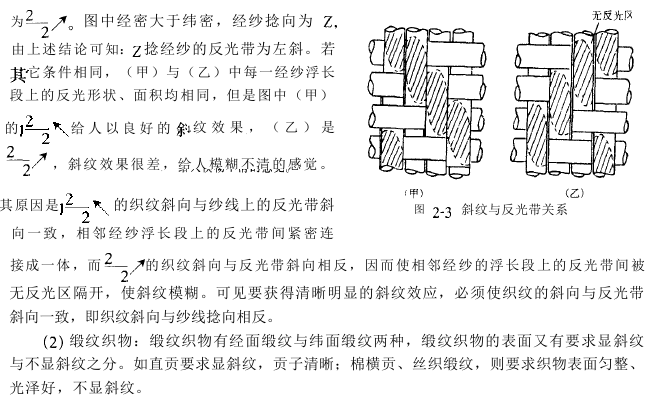 一、纺纱线的线密度 纺纱线线密度的确定是布料设计的主要内容之一。线密度大小对面料的性能起着决策性的作用,应根据面料的用途与特点加以选择。 在布料设计中,经纬线密度的配置普通有三种形式,即Ttj=Ttw,Ttj>Ttw,Ttj<Ttw。在大多数情况下采纳Ttj=Ttw与Ttj<Ttw两种形式。这是因为这种配置对生产治理比较有与利,织机的效率比较高。但在某些情况下为体现面料外观的特殊效应,也有采纳Ttj>Ttw的,假如经纬线密度不等,其差异都不宜过大。因为经纬线密度相差过大,会改变面料的几何结构相,使经、纬纱屈曲发生变幻,改变布料上作为支持面的纺纱线状态,影响面料的耐摩擦等服用性能。 二、纺纱线的捻度 纺纱线的捻度和面料外观、坚牢度都有关系,在设计时应根据布料的特点,对纺纱线的捻度提出肯定的要求。在临界捻度范围内,适当增添纺纱线捻度,可提高布料的强力,但捻度过大,则布料手感硬挺、光泽较弱,捻度较小的布料手感柔软、光泽较佳。设计过程中要根据布料中的经纬纱及纤维长度的不同,选择不同的捻系数。普通是经纱捻度略高于纬纱捻度,薄型面料捻度大于中厚型布料捻度,密切布料捻度大于松软布料捻度,线密度低的纺纱线捻度大于线密度高的纺纱线捻度,纤维长度短的纺纱线捻度大于纤维长度长的纺纱线捻度。 当布料用股线制织时,线和纱的捻度配合对面料强力、耐磨、光泽、手感均有肯定影响。 当股线和单纱的捻系数比值为√2时,股线强力高,当捻系数比值为1时,则表面纤维平行于股线轴心线,纺纱线光泽好,且纺纱线的结构较密切。由于在并捻过程中其单纱已除去了部分杂质,表面毛茸减少,所以线面料的耐磨性、手感和光泽均优于纱布料。 三、纺纱线的捻向及纺纱线浮长段上的反光带 纺纱线的捻向分为Z捻(右捻)S捻(左捻)两种,布料中经纬纱捻向的配合对布料的手感、厚度、表面纹路等都有肯定的影响。通常经纬纱捻向的配合有四种形式,即Z捻经纱和 Z捻纬纱、S 捻经纱和S捻纬纱的同捻向配合,Z捻经纱和S捻经纱,S捻经纱和Z捻纬纱的不同捻向配合。
