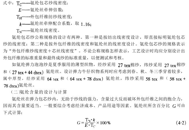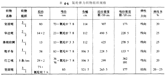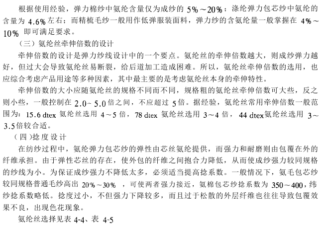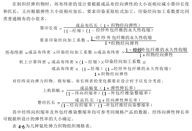 一、弹力布料设计小心事项 (1)产品规格设计除了使布料达到所需的风分外,还决策着布料经纬向所能得到的弹性。设计时首先要明确面料用途,确定布料所需的经纬向弹性大小,综合考虑原材料、线密度、组织、密度,以及纺纱线中氨纶牵伸倍数、氨纶含量、捻度等因素。 (2)经纬纱均采纳氨纶混纺化纤织物纱。由于氨纶归缩率的存在,实际上布料中的纺纱线处于一个不稳定的力学平衡状态,任何方向的弹性变幻,均会影响到另一方向的弹性。因此设计时应使经纬向弹性平衡。 (3)在张力松弛状态下氨纶丝的归缩,会导致面料经纬向下机后以及染整过程中产生较大的收缩。因此在工艺计算时要根据成品经纬向弹性大小加大筘幅与整经长度,并相应调整另外数据。