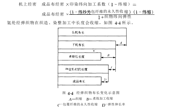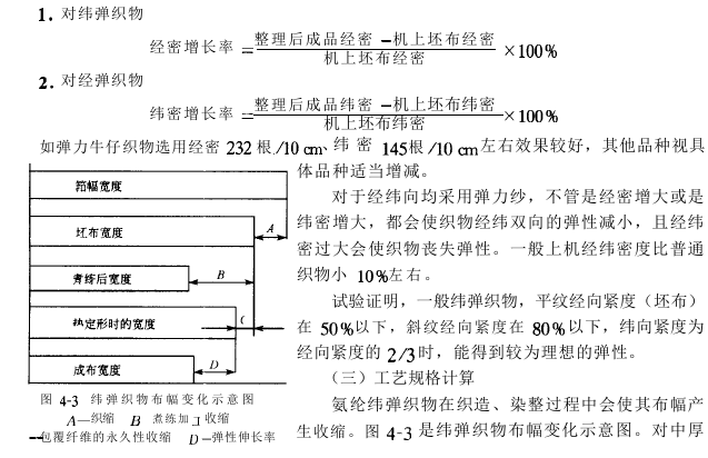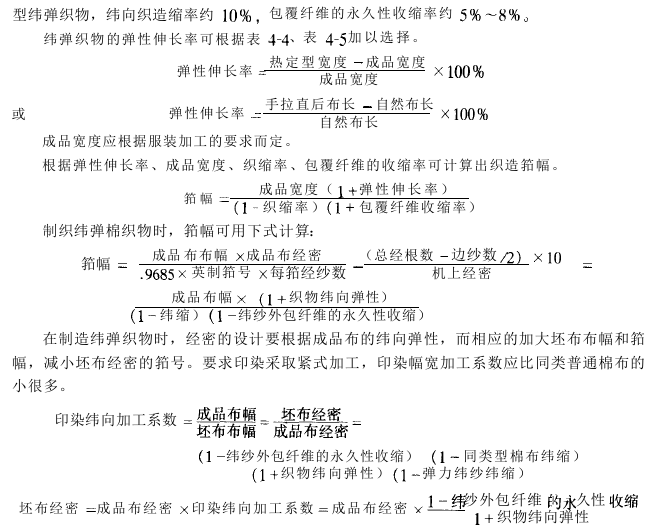 (一)面料组织的选择 布料组织直接影响布料的外观效应,其浮长线的长短直接影响面料的丰满程度与弹性。 试验证明:布料组织及密度是影响布料经纬向弹性的重要因素,纺纱线上的交错点越少(纺纱线浮长越长)、纱和纱之间的间隙越大(纺纱线密度越小),则面料弹性收缩程度越大,表现为布料的弹性伸长率大。 为使布料布面平坦,组织的选择应完可能使同一系统纺纱线上的交错点数相等,且浮长不宜过长,以小于或等于3根为好,这将有利于发挥弹力布料的弹性伸长率。如,可采纳方平、2/2斜纹、平纹、3/1斜纹、3 1/1 1变幻斜纹等。 (二)经纬密度的选择 经纬密度是决策产品外观、厚度、分量、弹性、手感的重要因素,尤其是弹性布料,直接影响到布料的有效宽度与缩率。密度过大,则面料过板过硬,影响舒适性;密度过小,则布料归缩过大,布料的尺寸稳定性差。如何解决这一关键性的问题,重要的原则是本色棉布的经纬密度要根据弹性伸长率或有效宽度的变幻而对成品的经、纬密度作相应的改变。假如本色棉布密度过大(经弹布料主要是纬密,纬弹布料主要是经密),则布料在湿热加工中无收缩的余地,而得不到预计的弹性伸长率与手感;但密度过小,也会影响布料的内在质量。 密度的设计和面料在各加工工序中的收缩有关。但影响收缩的因素颇为复杂,和外包纤维的种类、纺纱线线密度、纺纱线捻系数、面料组织、结构以及各道工序的工艺参变数均有关。 因此,应经过试织后确定整经长度、有效宽度、筘幅、经密、纬密等设计计算数据。在机密度到成布密度的变幻可用经密增长率或纬密增长率表示。