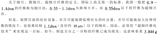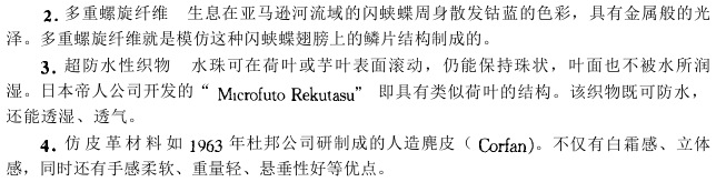 的超细丝,可把地球与月球连接起来。 (二)异形截面纤维类 大多数的高感性纤维截面都是异形。纤维截面异形化后可使布料的光泽、硬挺度、弹性、手感、吸湿、松散性、抗起毛起球、耐污性等得到不同程度的改善。 不同的截面形状能给予纤维不同的性能与风格。如三角形截面可赋予纤维真丝般的光泽与优良的手感;W形截面具有螺旋卷曲、似毛的松散性、粗糙感、干爽感等等。 异形截面纤维因具有很多优良特性与风格,故其用途日渐广泛,在工作装、地毯、非织造布、工业卫生等领域都有广泛用途。 (三)独特风格与特殊性能纤维类 从独特风格瞧,有超松散材料、超柔软材料、超悬垂性材料等三类,也可以三类相混合。 特殊性能纤维包含:感温变色纤维、紫外线变色纤维、抑菌纤维、消臭纤维、芳香纤维、吸水纤维、阻水纤维、蓄热纤维、导电纤维、难燃纤维等等。 (四)仿生纤维类 近来生物与生物系材料的高功能性被重新认识,基于仿生思路而进行新材料的开辟研究,在纤维与其他各领域广泛地开展。 1.超微坑纤维 人们发觉夜间活动的昆虫的角膜上整齐地平行罗列着微细圆锥状的突起结构,它能预防夜晚微弱光线的反射损失,使光穿透角膜球晶体。摹仿这种结构可把纤维制成表面具有微细凹凸结构的超微坑纤维其每平方厘米有40亿个微坑,使纤维具有深色的光泽。