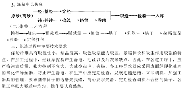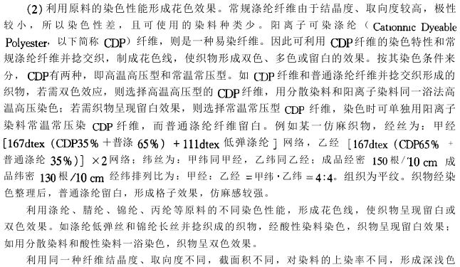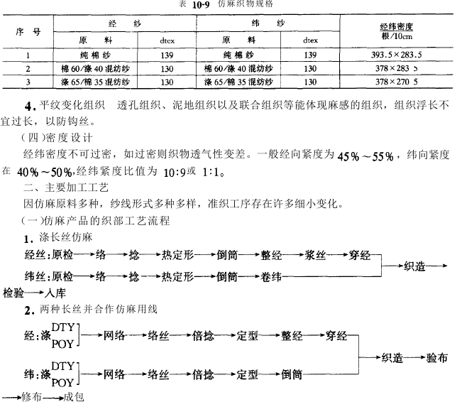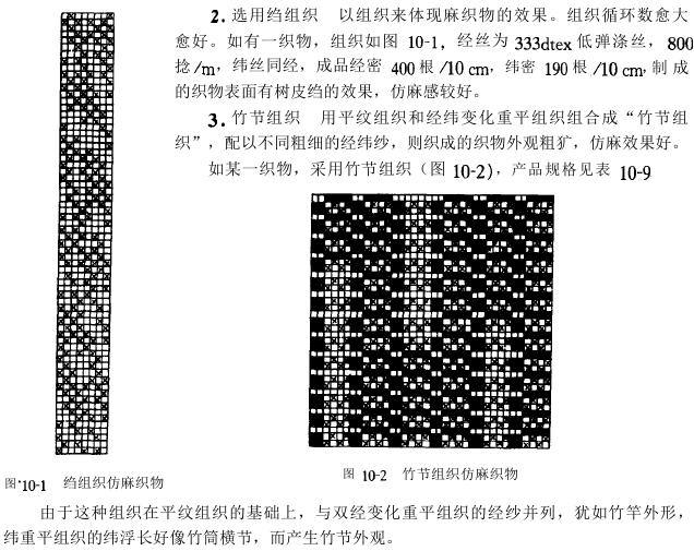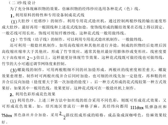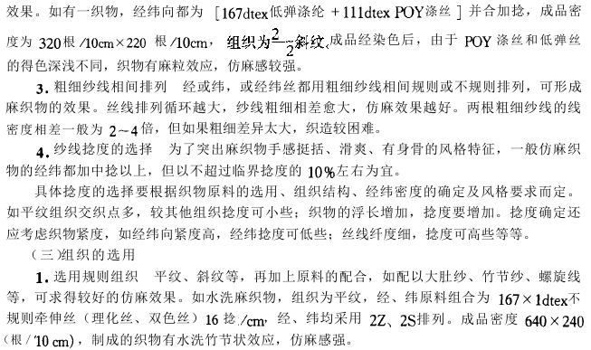 天然麻布料粗犷、挺括、透湿性好,具有独特的优点,在国内外市场享有盛名。但由于纯麻原材料的局限性,以其他原材料代替麻纤维,开辟设计仿麻布料是纺织行业设计人员研究的课题之一。 一、化学纤维仿麻面料主要结构参数设计 (一)原材料的选配 开辟充分体现麻面料效果的织物,原材料选配尤为重要。 1.麻纤维的结构特性 麻纤维的纵面大都较平直,有横节、竖纹,单纤维较棉短,纺纱要在半脱胶下进行,故纱线支数较粗,条干不匀率较高,呈现竹节状。因此选用聚酯纤维低弹丝、聚酯纤维竹节丝、聚酯纤维不规则牵伸丝(理化丝、双色丝)、聚酯纤维竹节纱、聚酯纤维疙瘩纱等原材料,其外观接近麻纤维纱,仿麻效果较为理想。 2.染整处理后的麻粒效应 由于麻纤维只含60%~80%的纤维素与半纤维素,含有比棉多的木质素、果胶、脂肪及蜡质灰分与糖类物质,其上色较棉纤维困难,匀染性也较棉纤维差,大多染浅色,经后处理后外观呈现麻粒状效应。故可选用以下原材料:原液丝与一般丝的组合丝;一般聚酯纤维丝与聚酯纤维改性丝、异形丝组合丝;聚酯纤维和聚丙烯腈纤维、锦纶、丙纶等组合丝或贴合丝;聚酯纤维DTY丝和FDT丝或FDT丝的组合丝。通过加捻上色处理后产生的麻粒效应,使其外观粗犷,从而达到仿麻效果。 3.仿麻原丝的纤度及截面形状 聚酯纤维长丝仿麻时,原丝线密度普通为135~300旦,丝素的单丝根数为24~48F;截面形状为六叶、八叶等异型丝。