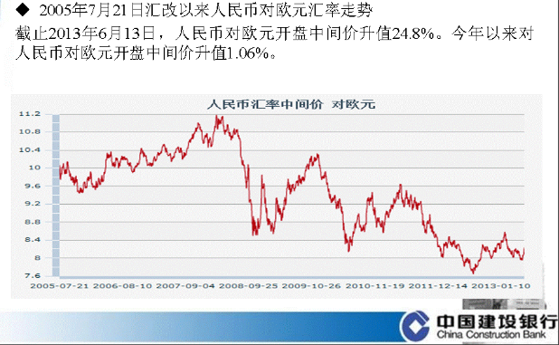 2.人民币兑欧元的汇率走势 2011年后一个交易日人民币兑欧元开盘中间价为8.3176元/欧元,开盘中间价的年内高点为7月25日的7.6473,开盘中间价年内低点为2月29日的8.4799,2012年后一个交易日的开盘中间价为8.1625,全年升值幅度为1.9%。年度大升值幅度为8.77%,大跌幅为1.91%,年内大波幅为10.33%。