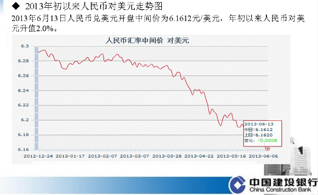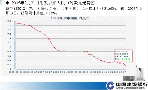 2011年后一个交易日人民币对美元开盘中间价为6.3009元/美元,2012年5月创出开盘中间价的年内高点6.2670元/美元,8月16日则为开盘中间价年内低点6.3495元/美元,2012年后一个交易日的开盘中间价为6.2855元/美元,全年升值幅度为0.25%。年度大升值幅度为0.54%,大跌幅为0.76%,年内大波幅为1.31%。 假如考虑到盘中交易价,低为6.34,高为6.2280,年度升值幅度为1.15%。 从这些指标上瞧,2012年人民币对美元汇率近似紧盯住。 之所以能维持相对狭小的波动,国内外条件相对较好。 从国内来瞧,经济增长不乐观,出口增速低于预期。 去年出口仅增长7.9%,仅比2009年好; 金融机构外汇占款仅增添4946亿元,央行外汇占款仅增添4281亿元,为近年来低值。 从国际上瞧,政治压力不大,美国忙于大选。