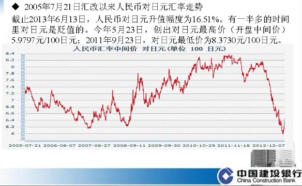3.人民币对日元汇率走势 2011年后一个交易日人民币兑日元开盘中间价为8.1103元/100日元,开盘中间价为2011年内高点为12月28日的7.2634,开盘中间价年内低点为2月2日的8.2846,2012年后一个交易日的开盘中间价为7.3049,全年升值幅度为11.03%。年度大升值幅度为11.66%,大跌幅为2.10%,年内大波幅为13.14%.
