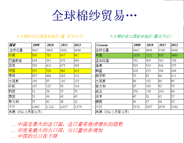 全球第二大生产商。 大的棉花纱线出口国(占24%)。 拥有4800万锭产能(每年新增300万锭)。 产量在480万吨。 75%是棉花纱线,其它是一些混纺化纤织物纱与人工合成类纺纱线。 20%出口80%用于内销。 高效现代化的纺织技术。 LMW(朗维),站达,Trutzschler,赐来福,村田,KTTM足主耍的机械供应商。
