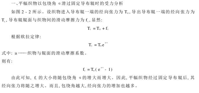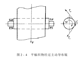 因此,平幅布料经过主动导布辊后,其经向张力将降低。平幅面料经过的主动导布辊越多,经向张力降低得也越多。 布料经向张力过小,在运行过程中会松弛,甚至产生皱褶。为了克服这种问题,有时使主动导布辊超速运行。这样,在面料和导布辊辊面之间产生肯定的打滑。 设布料和导布辊辊面间的滑动摩擦力为f4 ,打滑时布料输出端的经向张力为T′3 ,则有: