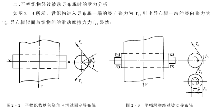导布辊的结构如图2-1所示,由轴头、闷头与辊体三部分组成。轴头是导布辊安装时的支承部位,轴头根据支承轴承的形式与导布辊的活动情况,可做成不同形状的台阶形短轴。辊体普通用镀铬无缝钢管或不锈钢管制成,也可以采纳包覆层,构成不同材质的辊面,如软橡胶辊、硬橡胶辊、尼龙辊等。轴头和辊体通过闷头采纳焊接连接。 按导布辊休闲状态不同,导布辊可分为固定导布辊与活动导布辊,而活动导布辊按动力来源不同又可分为主动导布辊与被动导布辊。 在不同的休闲状态与动力来源下,导布辊和平幅布料之间的摩擦作用不同,相应地对面料所产生的张力影响不同,从而改变布料的加工状态,终影响染整质量。因此,有必要分析导布辊和平幅布料之间的摩擦作用,知道它和平幅面料张力(尤其是经向张力)变幻的关系。 下面分析一下平幅布料通过导布辊时,经向张力的变幻情况。为便于讨论,暂不分析导布辊辊面的表面状态与平幅面料的柔性变形。