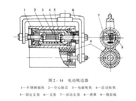 机头是主要功能部件,左右各一只,每只机头由一对小轧辊(一软一硬)、顶杆、气膜、气阀、触杆等构成。机头安装在支架上,并可归转肯定角度。普通使小压辊轴线和布料纬向成10°~20°角。当布料正常运行时,气阀打开,压缩空气通过气膜与顶杆使两只机头上的小轧辊均压在面料上,产生相等的吸边力。如布料左偏至肯定程度,边部碰到触杆,使左边机头的气阀关闭,气膜上的气压释压而使橡胶辊在自重的作用下向后倒,原先紧压面料的左侧一对小辊脱开,左侧吸边力消逝,面料则向右侧归移到中间位置。反之,则向左挪移。这样,改正了布料在运行过程中浮现的过分左右跑偏现象,使布料在同意的正常范围内挪移。 气动吸边器除使用压缩空气外,无需其他动力源,适用于较潮湿的生产环境,特别是对阻燃、防爆有要求的场合。气动吸边器操纵力小,且可调节,两辊间压力较大,并可按要求调节,动作灵敏,应用范围广,无电触点,安全可靠,而且安装方便。 2.电动吸边器 图2-14所示的是目前国内使用广泛的一种电动吸边器。它的一对压辊由一只不锈钢辊与一只橡胶辊组成。在不锈钢辊内装有固定的电磁吸铁与活动衔铁。吸铁和衔铁间装有弹簧,固定吸铁安装在支架上,活动衔铁和不锈钢辊体相连。当面料正常运行时,两辊间由吸铁弹簧加压,平幅面料两边的吸边力相等。当布料偏移时,即碰到触杆,通过操纵元件,使吸铁工作,克服弹簧压力,使一对压辊脱开释压,面料向另一边归移,从而改正了偏移。