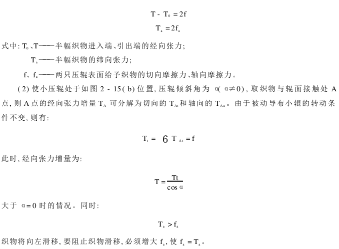 电动吸边器结构紧凑,动作灵敏,两辊间压力大,纠偏及展幅效果较好,特别适用于干燥环境及速度要求较高的场合。但由于不锈钢辊的密封性差,吸铁的动作由触杆与电气触头操纵,对保养的要求高。 三、吸边器的工作原理 吸边力的产生,和布料的物理状态紧密相关。由于布料是柔性体,当客观存在的经向张力大到肯定程度时,就会产生一个从左右两侧指向中间的力Ta ,使面料产生纬向收缩,这就是纬向张力。若这时面料和一被动导布辊接触,被动导布辊将在经向摩擦力f的反作用力f′的作用下转动。同时,辊面轴向摩擦阻力的存在,将阻挠布料的纬向收缩。 为了便于分析,忽略面料经纬纱之间的相互作用力,假设纬向扩展力较经向张力大而使面料在扩展过程中惟独经纱产生蜿蜒,并且不考虑布料离开小压辊轧点后的弹性收缩。 如图2-15所示,现设吸边器两只小压辊倾斜角为α,压辊扩展布料的有效长度为l0 ,布料自上向下运行。