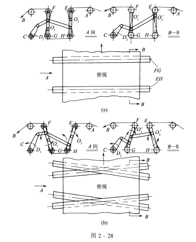 2.四辊整纬器 图2-27所示的四辊整纬器是目前国内使用较为普遍的一种。它主要由四根整纬辊与调节机构组成。各整纬辊之间分离依靠双列向心球面球轴承和两组连杆相连。 假如面料正常运行,则各整纬辊相互平行,布料左右边部在被动导布辊A与B之间的穿行长度相等,如图2-28(a)所示。在布料全幅内的经向张力大小一致。各经纱相对运行速度相等,亦即运行中的经纱各段无相对“超前”或“滞后”的现象。 当发觉纬纱向左后歪斜时,旋动手轮,使丝杆转动,带动连杆D1 、D2 分离绕O1 、O′1 点按B点方向归转肯定角度。四根整纬辊左右两端按图2-28(b)所示方向的变幻而不再平行。布料在辊A与辊B之间的穿行长度是左边缩短,右边伸长。运行布料全幅内的经向张力浮现从面料中央线向左递减而向右递增的变幻(设布料中央线和整纬辊中央线重合),摩擦力向左递减,从而引起面料中各经纱的线速度也产生向左递增、向右递减的变幻。这样,左后直线形纬斜的纬纱,在运行中逐渐恢复到正常位置。图2-28(c)所示为右后直线型纬斜整纬的情况。