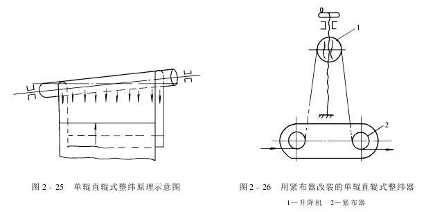 当发觉布料纬纱向左后直线歪斜时(面对进布方向瞧),转动左端丝杠,使中辊(即整纬辊)的左端下降;或转动右端丝杠,使整纬辊右端升高。这样,纬纱的滞后部分放松或超前部分被拉紧,使纬斜得到改正。 认真分析布料在全幅内经向张力的变幻情况,可以进一步知道整纬的物理过程。当整纬辊水平放置时,即和面料纬向平行,经向张力在面料全幅内的分布是均匀的,各经纱的相对运行速度也一致;当整纬辊浮现歪斜,如右端高于左端时,布料的经向张力就产生了从右至左的递减,如图2-25所示。布料和辊面的摩擦阻力也发生同样的递减。于是,布料经纱的运行速度发生从右至左递增,即整纬辊左端的经纱速度大,右端的速度小。和经纱相交的纬纱也就浮现右端变慢、左端加快的现象。这样,左后直线型纬斜就得到了改正。图2-26是利用紧布器改装的一种单辊直辊式整纬器。它结构容易,效果颇佳,但只能调整3°以内的直线纬斜。