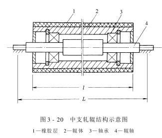 由于一般轧辊两端受集中载荷,辊体受均布载荷,易产生弯曲变形。这种弯曲变形,使轧辊间的线压力形成中间小两端大的分布,造成轧液不匀。图3-19(a)是中高轧辊示意图。这种轧辊的辊体做成中间大、两头小的橄榄状。由于辊体的直径中间大于两端,迫使中间线压力增添而两端线压力减小。假如中间的修正值选择合适,使它和轧辊加压后弯曲变形的挠度值相同,即可以使辊体工作表面均匀接触,轧点接触线尽全吻合,取得轧液均匀的效果,如图3-19(b)所示。在实际生产中,轧车的压力经常因工艺条件的变幻而改变。但这种轧辊结构容易,创造方便,在印染厂使用比较普遍。 图3-20是中支轧辊的结构示意图。这种轧辊辊体的支点内移,相当于减小了房梁的跨距。在同样的载荷条件下,挠度减小,即减小了轧液的不均匀度。