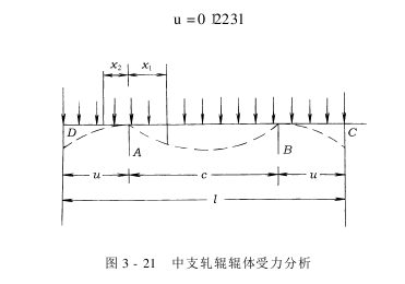 将辊体简化成简支梁,其受力状况如图3-21所示,挠度只是减小,而未消逝。因此,整个纬向的轧液均匀性问题并未解决。但是,假如能使轧辊的中间挠度与两端挠度相等,则可以解决中浅边深的颜色差异。通过计算可知,此时轧辊的挠度已大大减小,其大值仅为一般轧辊的20%,因此,对提高轧液均匀度有肯定的效果。设辊体长度为l,则此时辊体两支点的内移量为: