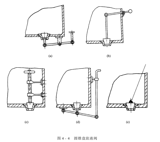圆锥盘放液阀的材料,可根据工艺要求而定。如冷热水槽,可采纳HT20—40或ZH62材料;碱性液槽,可用HT20—40材料;酸性液槽,可用ZH62材料;不锈钢制的水槽,其圆锥盘放液阀的阀座材料采纳不锈钢,其阀芯材料可采纳橡胶,这样可预防渗漏。 圆锥盘放液阀的配合锥度常取1∶1.2(1∶1.0或1∶1.5均可),加工后需用研磨砂研磨,圆锥表面不得有气孔或砂眼,并做渗水试验,要求不漏。 (2)旋塞放液阀:如图4-5所示,普通为铸铁制成,其配合锥度为1∶7,光洁度及技术要求和圆锥放液阀相同。 (3)橡胶圆球放液阀:它用于不锈钢水槽,如图4-6所示。在不锈钢槽的出液口,置一个软橡胶球,球的外径应比出液口内径大些,圆球两端和出液管上均有圆柱销钉,销钉间装两根不锈钢拉簧,以弹簧拉力将圆球紧紧阻塞放液口。放液时,操作人员将圆球拉离放液口即可。这种结构适用于冷水或温水槽。各种放液阀的分析对照见表4-3。
