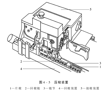 在织机冷启动时,在第1~2次投梭期间,片梭制动器将闭合7级,在第3次投梭时将放松一级,以后每27次投梭后松开一级,直到有一个深入的片梭到达位置Ⅱ为止。然后,片梭制动器将再自动闭合一级。 P7300型片梭织机的电子操纵自动制梭装置采纳的是微电脑操纵的步进电动机(P7100型片梭织机的电子操纵自动制梭装置采纳的是步进电磁铁)来自动调整制梭的松紧程度。采纳微电脑操纵的步进电动机对片梭进行制动,更有利于通过微电脑编程来精确操纵步进电动机的步进位移,由于采纳的是德国生产的高精度的步进电动机,因此对片梭制动力大小的操纵更加精确,电子操纵自动制梭装置的可靠性更加提高。它的工作过程是:通过传感器监视片梭抵达接梭箱,然后对片梭的位置进行识别,由微电脑操纵的步进电动机来自动调整制梭的松紧程度,对片梭进行制动,并且在一次引纬时间内完成自动调整。这样,减少了制梭衬垫板和片梭的磨损。 8.开梭装置(接梭侧)和压梭装置 接梭侧开梭装置的作用是:将被回梭杆推回的片梭上的纱夹打开,并将被布边纱夹夹住的纬纱的一端放开,然后,当前片梭制动器处于上升的位置时,片梭被同一只开梭器推进压梭道内。 压梭装置如图4-5所示,片梭织机每转动一周,压梭装置将一只片梭1从接梭装置5压入回梭装置4,使片梭进入回梭链2的两个链节3之间。如果需要改变织有效宽度度,则需移动接梭装置5相对于不断移动的回梭链2的回梭链节3的位置。