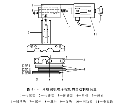 7.电子操纵自动制梭装置 片梭织机电子操纵自动制梭装置及片梭的三种不同定位位置如图4-4所示。当片梭4进入接梭箱处于正常的定位位置Ⅰ时,这时片梭同时遮住传感器1和3的开关坐标S,电子操纵自动制梭装置的自动调节部分没有反应。 当片梭4进入接梭箱处于定位位置Ⅱ时,表示片梭4进入接梭箱过于深入,这时片梭遮住传感器3的开关坐标S,但没有遮住传感器1的开关坐标S。对于每一个太过深入的片梭,片梭制动器将闭合一级。侧板5上的传感器1发出信号,通过电气操纵箱的逻辑电路和执行电路使步进电磁铁11带动螺杆7转动一级,使楔型滑块8在导块9中向右移动一级,由于楔型滑块8的作用,制动块6向下移动一级,即片梭制动器将闭合一级。 当片梭4进入接梭箱处于定位位置Ⅲ时,表示片梭4进入接梭箱不够深入,片梭没有遮住传感器3的开关坐标S:如果27个片梭中的20没有到达传感器3的开关坐标S,则在27次投梭之后,片梭制动器10将松开一级,直到有一个深入的片梭到达位置Ⅱ为止。然后,片梭制动器将再自动闭合一级。