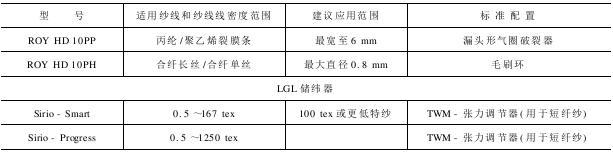 梳形制动器配备有三种不同的节距,供纬纱选用: 13mm节距:用于特数大于1000dtex的多纤维合成长丝,或者直径小于0.15mm的合纤单丝。 15mm节距:用于聚丙烯裂膜条PP。 18mm节距:用于表面PU涂层的多纤维合成长丝,或者直径大于0.15mm的合成单丝。 其它,15mm节距和18mm节距的梳形制动器要用功率较大的步进电动机操纵,根据纬纱的种类特点,梳形制动器仅需更换顶部的梳形导纱架。 (3)弹簧片制动器制动装置:弹簧片制动器制动装置是靠两弹簧片对纬纱的夹持力来制动的。这种制动装置主要用于特别细支的毛纱。它的特点是:制动作用柔和和缓,制动片柔顺灵敏,故可有效降低纬纱断头率。此型制动器不要求纬纱预先被张紧,即从储纬器输出的纬纱其张力可调节到小状态。 6.储纬器 随着片梭织机引纬速度的提高,储纬器已经成为必不可少的保证纬纱顺利地从筒子上退绕和引入梭口的工具。表4-3是P7300型片梭织机上储纬器的配置。