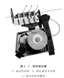 4.单色、二色、四色、六色引纬机构 单色引纬机构,无织机有效宽度限制,其机构和二色、四色引纬机构相同,但不带选色装置,纵面配置纬纱张力杆和递纬器。 二色引纬机构配有电子操纵二色选色装置,是由一块简单的电磁铁操纵电子选色装置,它可用于单色引纬、混纬和编程操纵二色引纬;可通过机上电脑终端或中心集中操纵的电脑软件smartweave编制选色操纵程序。 四色引纬机构(SMA4)配有电子操纵的四色选色装置,采纳伺服电动机直接驱动选色装置,和电子多臂机或踏盘开口机构(或大提花机)相配合。 六色引纬机构(MSA6)配有电子操纵的六色选色装置,和四色选色装置相同都是采纳伺服电动机直接驱动选色装置,和电子多臂机或踏盘开口机构(或大提花机)相配合。采纳伺服电动机直接驱动选色装置的优点:在做三级跳跃选色时,不需降低织机的速度;减少了大量的机构零部件,结构紧凑;纬纱断头时,可自动执行纬纱替补。 5.电子操纵纬纱制动装置电子操纵纬纱制动装置和纬纱张力杆组成纬纱张力器,其作用在于在整个引纬过程中保证纬纱的张力和位置精确无误。 电子操纵纬纱制动装置的制动过程: (1)在织机投梭之前,装在织机主轴上的信号盘发出信号,使纬纱制动装置在织机投梭之前开放。 (2)当片梭飞行到离接梭箱还有肯定的距离时,装在筘座上该处的触发器发出信号,使纬纱制动装置开始对纬纱进行制动,制动力的大小可通过编程来操纵。 (3)根据引纬速度和纬纱的特性来确定佳的制动时间,可通过编程来操纵延时制动的时间。 P7300型片梭织机电子操纵纬纱制动装置有单只或二只制动靴制动器,梳形制动器和弹簧片制动器三种。这三种电子操纵纬纱制动装置的纬纱制动力都是靠电子操纵的步进电动机来实现的。 (1)单只或两只制动靴制动装置:单只或两只制动靴制动装置是由制动靴、制动薄钢片和步进电动机等组成的。通过步进电动机驱动制动靴对制动薄钢片的压紧程度的不同,使纬纱在制动靴和制动薄钢片之间产生不同的摩檫力,实现对纬纱的制动。单只或两只制动靴制动装置主要用于短纤维纺纱线;用于加捻的合纤长丝纺纱线,大支数为1000dtex。这种制动装置优点是:对纬纱的制动作用缓和柔和,并且每种纬纱的制动力可单独编程操纵。 (2)梳形制动器制动装置:如图4-3所示,梳形制动器制动装置是靠移动导纱架1下移,使纬纱在移动导纱架栅柱3和固定梳形导纱架2的导纱孔之间折绕,从而对纬纱产生肯定的制动阻力。这种制动装置的特点是:对纬纱的制动作用缓和柔和;每种纬纱的制动力可单独编程操纵;纬纱接触的是高耐磨陶瓷导纱件。