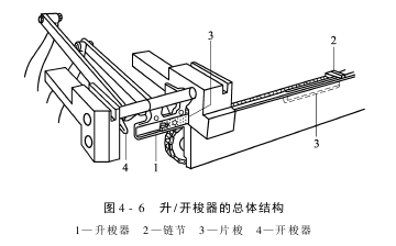 9.升/开梭器 升/开梭器的总体结构如图4-6所示,完成引纬工作的片梭从织机右侧的接梭箱中被推出,并被送入回梭链上,织机每转动一周,回梭链上的一个链节2就会把一只片梭3推入升梭器1里,然后开梭器4开始伸入位于升梭器1里的片梭3的孔中,使梭夹的钳口逐步打开,同时,升梭器1和开梭器4一起向上转动,把纱夹张开的片梭3由垂直位置升到水平的投梭位置。随后开梭器4就开始下降,使片梭的纱夹闭合,把递纬夹送来的纬纱的头端夹住。当片梭3离开升梭器1后,升梭器1就会向下转动,由水平的投梭位置再次回到垂直位置,以接受回梭链送来的另一只片梭。