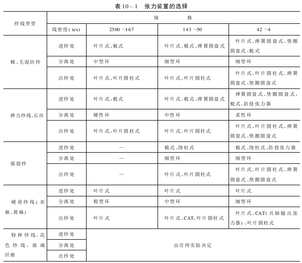 进纱处张力装置张力偏小,会造成纱圈在鼓面上滑动过大,当纱圈充满整个鼓面时又会导致后继纱圈重叠。张力偏大,纱圈在鼓面上滑移阻力增大,也会造成后继纱圈过度的紧密排列,有时甚至造成纱圈重叠。应根据纺纱线类型、张力装置的配置位置等因素,选择张力装置的规格(表10-1)。