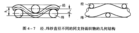 这样的结构相,定义为0(零)结构相。在这种条件下的布料切面图如图4—7所示。布料的几何结构相不同或支持面不同时,其性能和风格不同。在许多传统的面料中,对应于面料的风格特征,都具有相应的几何结构相。例如,府绸或卡其等布料,都是经纱线支数持面,必须具有较高的几何结构相;麻纱、横贡缎与拉绒本色棉布,都是纬纱线支数持面,必须具有较低的几何结构相;各类平布、涤棉布料与胶管帆布类布料,经、纬纱在面料的使用过程中,同时承受外力的作用,都需要构成同支持面的面料。因此,这些面料的几何结构相,普通都处于第5结构相或者,0结构相附近。