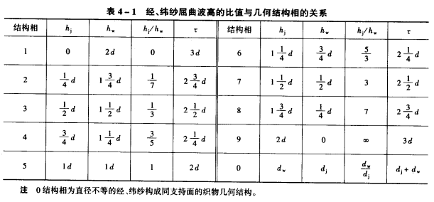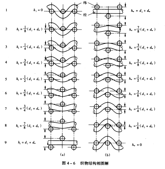 经、纬纱的屈曲波形是在两种极端状态之间变幻的,这种变幻对布料的性能和外观有重要影响。经、纬纱的屈曲波形在这两种极端状态之间可以延续地变幻,可以有无数种屈曲状态。但是为了便于研究与比较,需要设定一些特殊的波形状态。经、纬纱在特定波形时的几何结构状态称为面料的几何结构相,简称结构相。