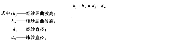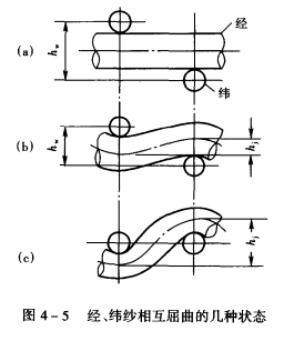 经、纬纱在布料中相互屈曲,其屈曲的程度可以用屈曲波高来描述。经、纬纱在布料中屈曲状态如同波纹一样,假设以纱的中央线为代表,我们可以得到一条波纹状曲线。这条波纹曲线的波峰到波谷之间的高度差称为屈曲波高。如图4—4所示,hj,为经纱屈曲波高,hw为纬纱屈曲波高。