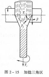 1.内外转移 当须条从细纱机前罗拉握持处吐出,便受到纺纱张力及加捻作用,使原来和须条平行的纤维倾斜,纱条由粗变细。把罗拉吐出处到成纱的过渡区域称为加捻三角区,如图2—15所示。图中Ty为纺纱张力,β为纤维和纱轴的夹角,Tf为纤维由于纺纱张力而受到的力,Tt为Tf沿着纱芯方向的分力,称为向心力。从图2—15中可以得出: