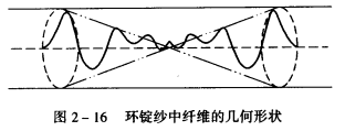 从上述可分析出,随着纤维在纱中所处半径的增大,向心力Tt也增大,即处在外层的纤维的张力与向心力较大,简单向纱芯挤入(向内转移),而处在内层的纤维张力与向心力较小,易被外层纤维挤到外面(向外转移),形成新的内外层关系,这种现象称之为内外转移。一根纤维在加捻三角区中可以发牛多次这样的内外转移,从而形成了复杂的圆锥形螺旋线结构,如图2—16所示。