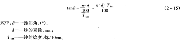 捻归角β可用来表示不同粗细纺纱线的加捻程度。两根捻度相同的纺纱线,由于粗细不同,加捻程度是不同的,粗的纤维加捻程度较大,捻归角β亦较大。捻归角直接测量需用显微镜,使用目镜相物镜测微尺来测量,既不方便又不易测难确,所以实际中需要时用式(2—15)计算。