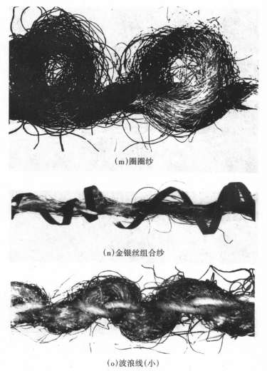 花式线:用特殊工艺制成,具有特种外观形态和色彩的纺纱线,包含花色线与花饰线。是由芯纱、饰纱与固纱在花色捻线机上加捻形成,表面具有纤维结、竹节、环圈、辫子、螺旋、波浪等特殊外观形态或颜色。