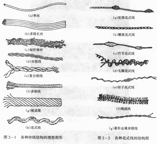 按纺纱线的结构外形大体可分为10种纱,见表2—1。各种不同类型纺纱线结构见图2—1所示,图2—1为各种纺纱线的理想结构,图2—2为花式线结构;图2—3为形体纱与弹力丝结构,图2—4为实物照片。