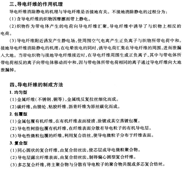 纺织材料普通为绝缘物质,具有较多的电阻率,特别是合成纤维,如涤纶、聚酰胺纤维、聚烯烃纤维等多为非极性材料,吸湿性差,导电性低,它们会因为摩擦而产生静电。由于这样的合成纤维织成的布料在使用时可带10kv以上的高电位,所以不可幸免地会产生放电现象,有时会对人体或仪器设备造成极大的危害。在炸药、煤矿、石油、化工与纺织等行业都可能因静电放电火花而引起易燃、易爆物的起火爆炸。化纤和灭然纤维如醋酯纤维、变丝、羊毛等因其具有吸湿性,和合成纤维相比因摩擦引起的静电要强,但假如处于低湿环境中仍会产生静电现象,产生很多危害。因此对纤维及其布料的抗静电性能越来越为人们所重视。无论从预防危害角度还是从操纵产品质量的角度来说,去除静电隐患已成为人们生产与生活中亟待解决的问题。